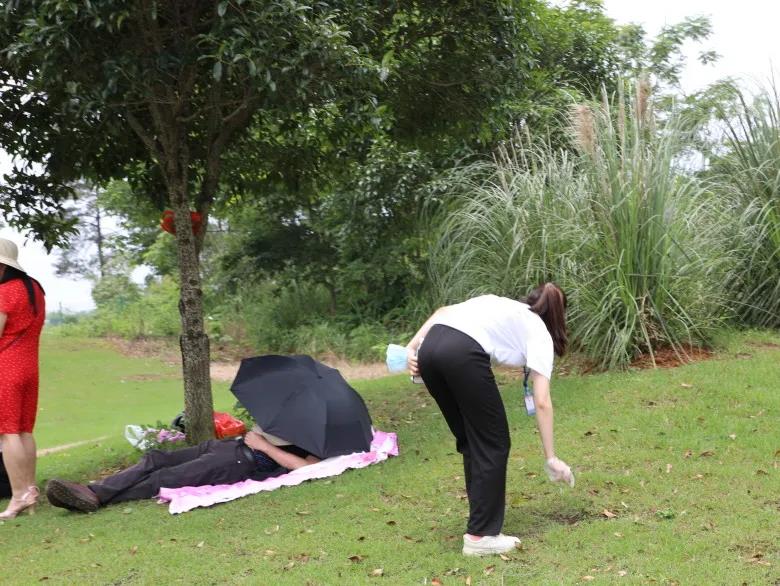 05行政部和運營部的同事看到草地里有喝剩的飲料瓶,他們扒開草堆撿出來,護欄里有冰糕棍,他們將身子探出去一大半,伸長胳膊撿,不到十分鐘垃圾袋里就裝滿了一半。