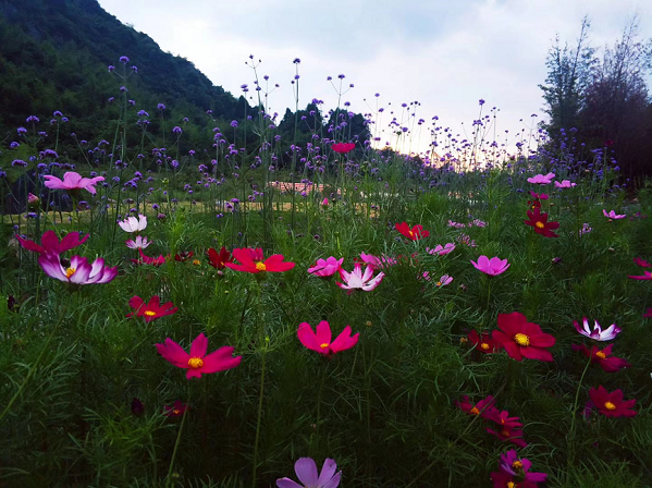 走過了春的旎旖,迎來了夏的蓬勃,走進大碧頭一棵棵高大的樹木像一把把綠色的大傘,撐起了一片片濃重的綠蔭。期望能擋住頭頂?shù)难籽琢胰?。給人們帶來一絲清涼。山腳下小溪邊格?;▋猴L(fēng)柔情長,矮矮的像新娘的捧花,借著格?;ǖ娜崆?。一簇簇紫色淡雅的馬鞭草靜靜地站在花叢中相互輝映。在微風(fēng)中輕盈的搖曳著。像極了新娘頭上隨風(fēng)飄搖的紗巾。把大碧頭這個"新娘"打扮的格外漂亮。又仿佛一條飄逸的彩帶圍繞著大地景觀。